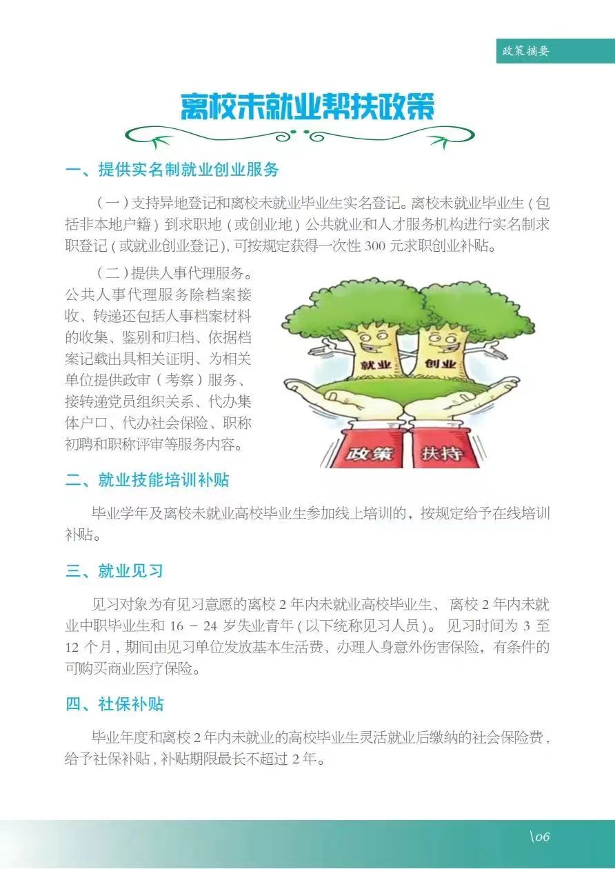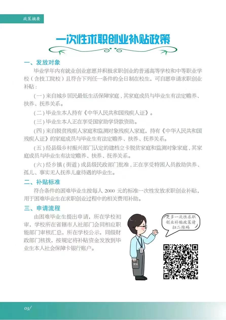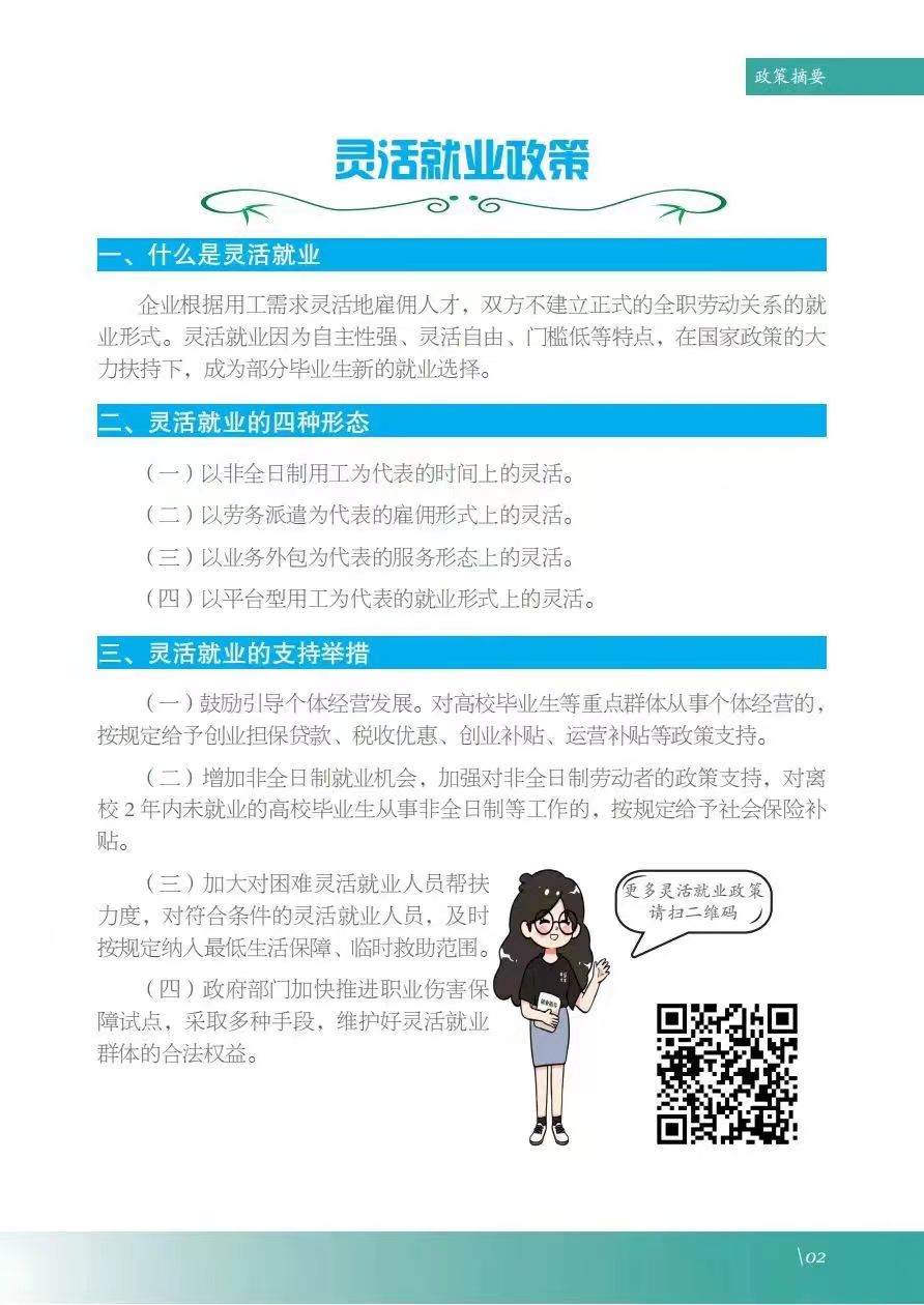 《服务指南》涵盖政策摘要、就业指导、政策性岗位介绍、就业服务等内容,其中政策摘包含灵活就业、自主创业、应征入伍等;就业指导包含升学、考公考编、就业准备、权益维护等;政策性岗位介绍包含三支一扶、选调生、特岗教师、科研助理岗等;就业服务包含毕业生签约流程、就业手续办理、档案及党团组织关系转递、就业信息获取渠道及就业主管部门通讯录等。