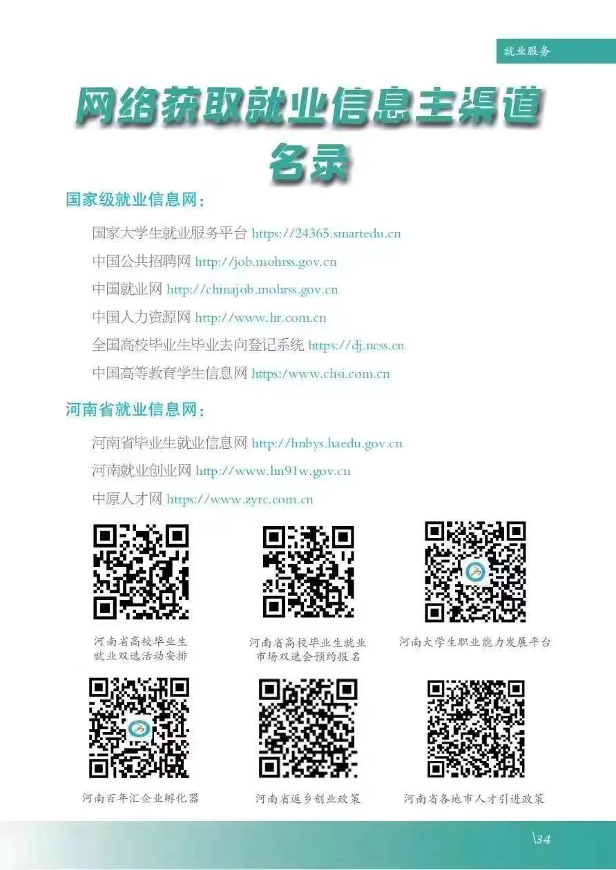 为方便大学生深入了解国家和我省高校毕业生就业创业政策,充分做好就业准备,省教育厅联合有关部门及高校结合当代大学生特点,采用图文并茂、视频动画等方式,编撰了《河南省大学生就业创业服务指南》。《服务指南》采用线上线下相结合方式发布,线下纸质版发放至各高校,线上可在河南省毕业生就业信息网下载全文,还可扫描文内二维码观看河南省大学生就业e指导系列短视频和河南省“互联网+就业指导”公益直播课。