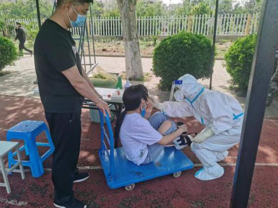 近期每一天的核酸检测给脚部受伤的王云青带来了不小的麻烦,下楼到操场的核酸检测点有很长一段距离,院领导在得知此情况后,现场协调工作人员,借来了推车和三轮车,推着学生完成了核酸采集,并且安排三轮车送学生到宿舍。
