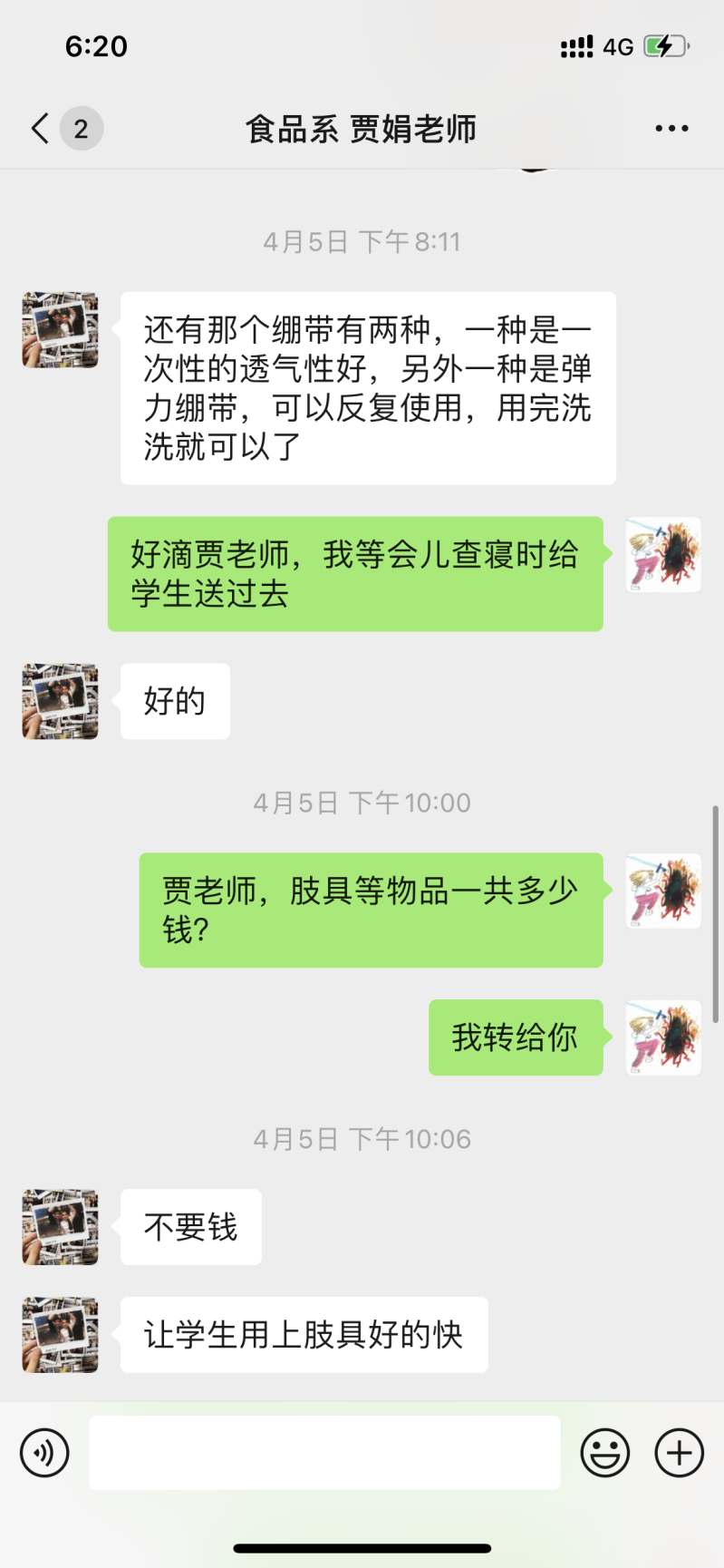(校外志愿者食品学院贾娟老师看见求助信息后第一时间联系吴筱艾老师,将自己家里的弹力绷带和肢具送到学校)