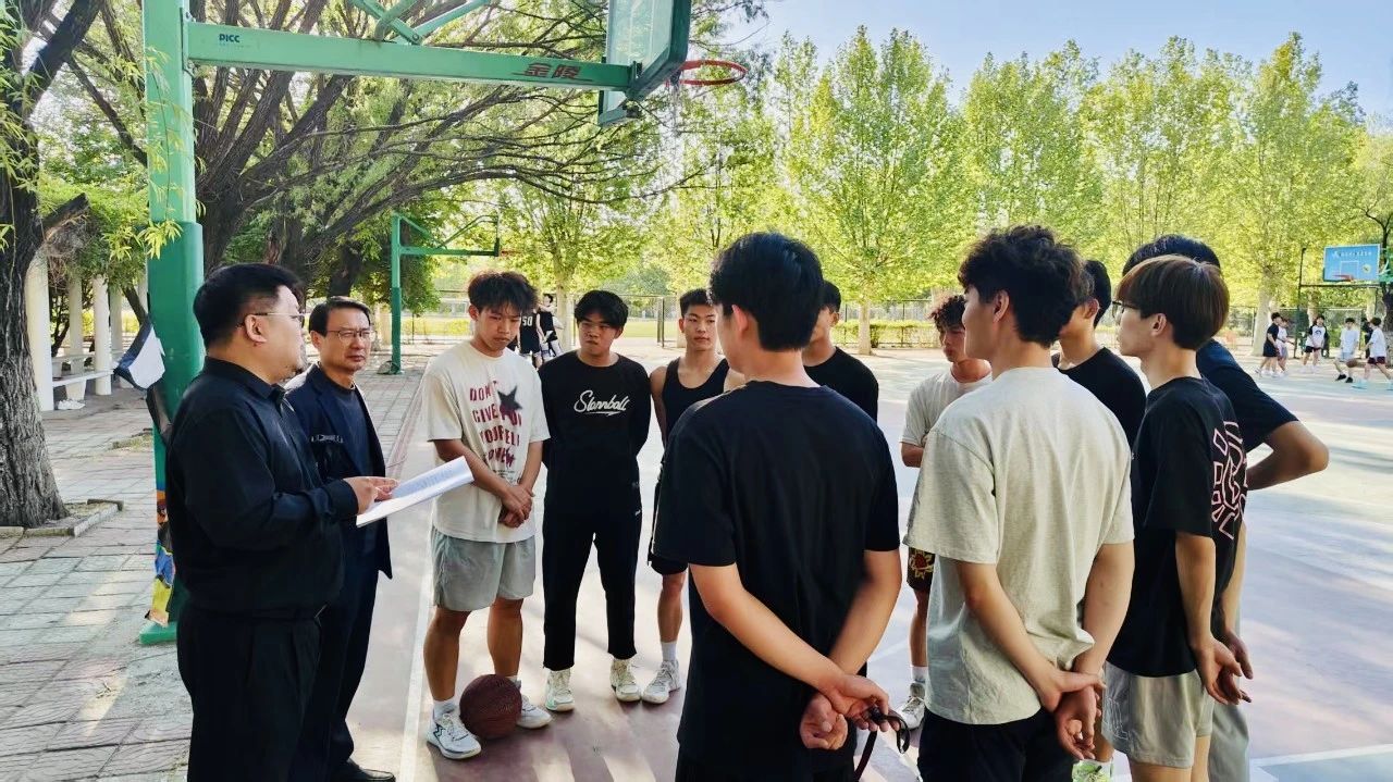 为迎接学院首届大学生篮球联赛,近日,我系参赛队员在篮球场展开高强度集中训练,以饱满的热情和昂扬的斗志积极备战。4月14日下午,系党总支书记耿鹏坤、学管负责人潘智睿一行亲临训练现场视察指导,为队员们加油鼓劲,并针对备赛工作提出具体要求。