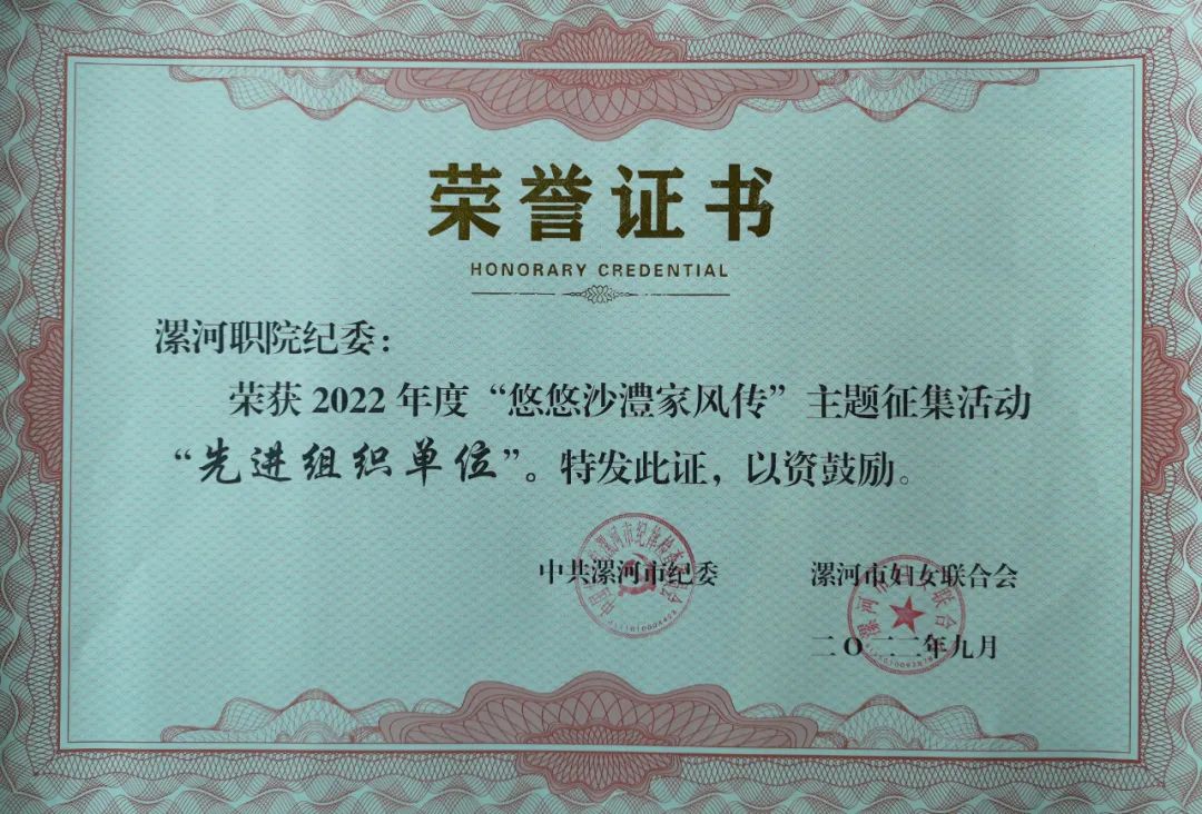 近日,中共漯河市纪委机关、漯河市妇女联合会联合发文《关于表彰“悠悠沙澧家风传”主题征集活动获奖作品和先进组织单位的决定》(漯纪〔2022〕100号),球盟会官方网站,qm球盟会网页登录荣获2022年度“悠悠沙澧家风传”主题征集活动先进组织单位。本科部王方、旅游系吴筱艾、退休教师刘春亮、组宣部王丹分别获得“家风故事类”一等奖、二等奖、二等奖、优秀奖,工商管理系李肖飞、荣长玲分别获得“勤廉家书类”二等奖、优秀奖,成教部帅行明获得“家规家训类”二等奖。