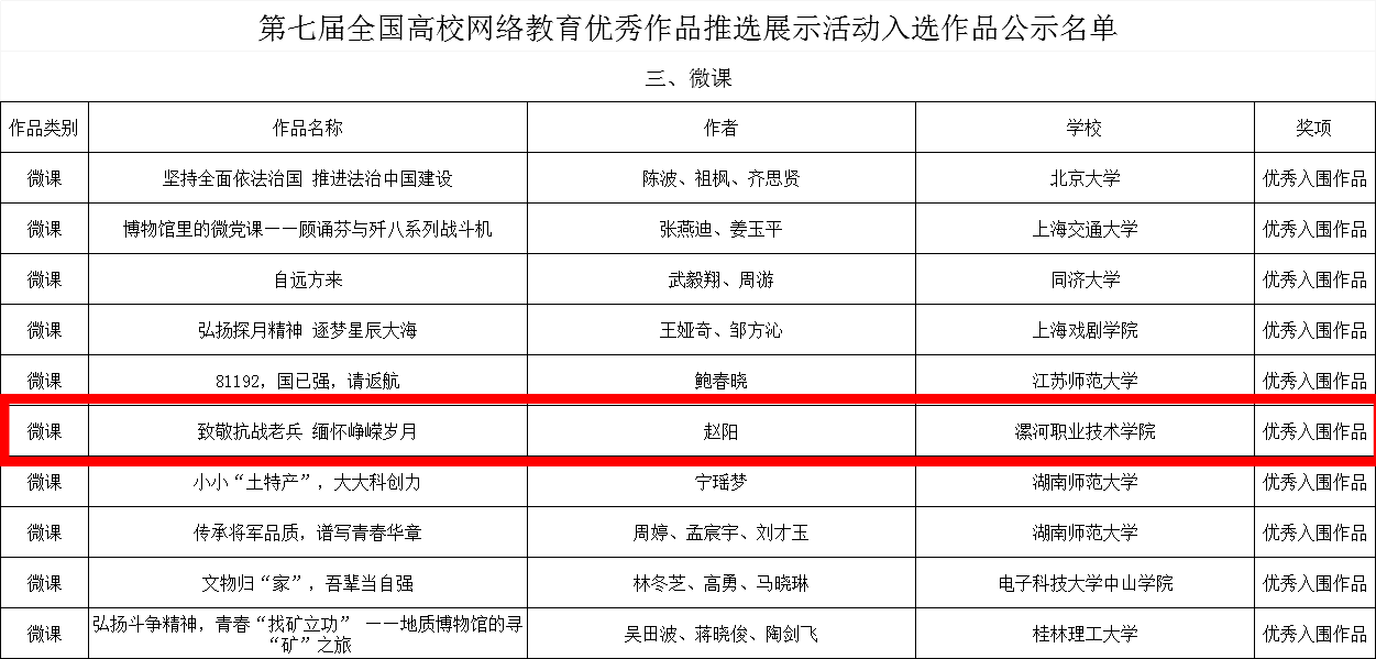 近日,由教育部思想政治工作司、中央网信办网络社会工作局主办的第七届全国大学生网络文化节和全国高校网络教育优秀作品推选展示活动遴选结果公示。经过资格审核、专家遴选(初选、复选、终选)、作品政审等程序,由我校球盟会官方网站,qm球盟会网页登录教师赵阳创作的微课作品《致敬抗战老兵 缅怀峥嵘岁月》和音频作品《曾经当过兵》从全国50771件作品中脱颖而出,获得“优秀入围作品奖”2项。