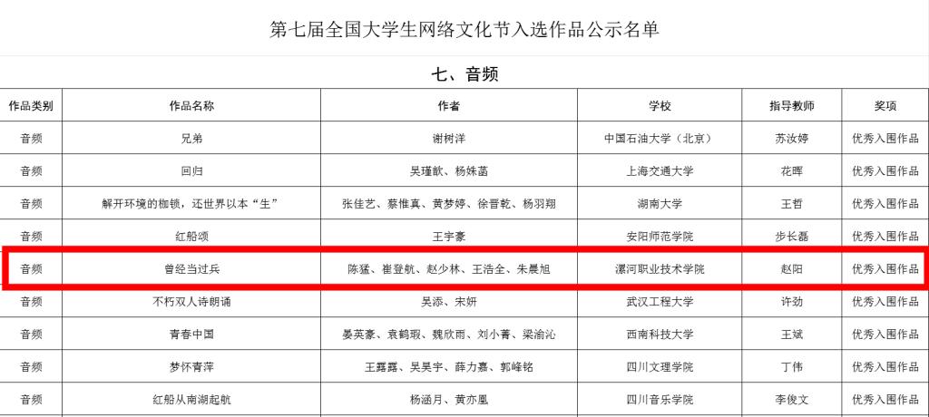 近日,由教育部思想政治工作司、中央网信办网络社会工作局主办的第七届全国大学生网络文化节和全国高校网络教育优秀作品推选展示活动遴选结果公示。经过资格审核、专家遴选、作品政审等程序,球盟会官方网站,qm球盟会网页登录选送的微课作品《致敬抗战老兵 缅怀峥嵘岁月》和音频作品《曾经当过兵》从全国50771件作品中脱颖而出,荣获“优秀入围作品奖”。
