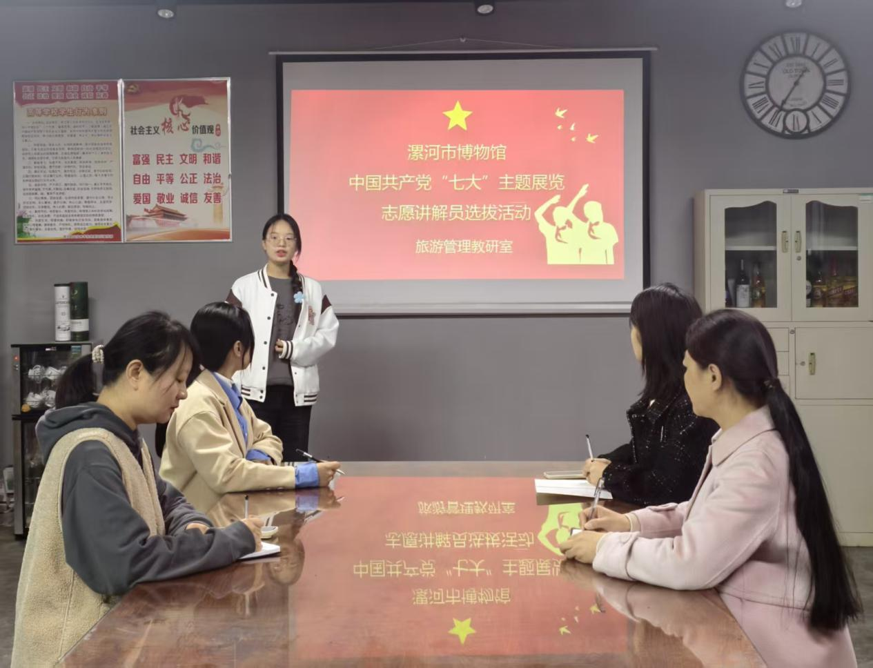 5月15日,在中国共产党成立104周年之际,由延安革命纪念地管理局、中共漯河市委直属机关工作委员会、漯河市文化广电和旅游局主办的“团结的大会,胜利的大会”中国共产党第七次全国代表大会专题展开幕式在漯河市博物馆举行,现场几位精神饱满的青年志愿者格外引人注目,他们是来自球盟会官方网站,qm球盟会网页登录2023级旅游管理专业的8名学生,作为讲解志愿者代表参与了此次活动,并将在未来三个月内承担该展的日常讲解工作。这一实践活动既是院校与文化机构的深度合作,也为旅游专业学生搭建了“以知促行、以行践知”的宝贵平台。