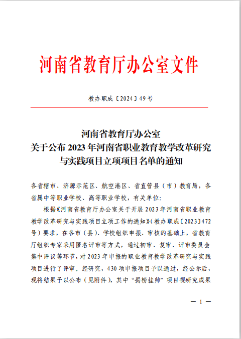 近日,河南省教育厅公布了2023年河南省职业教育教学改革研究与实践项遴选结果,我系《“四链融合”视角下高职院校智慧旅游人才培养模式创新与实践》项目获规划项目立项。